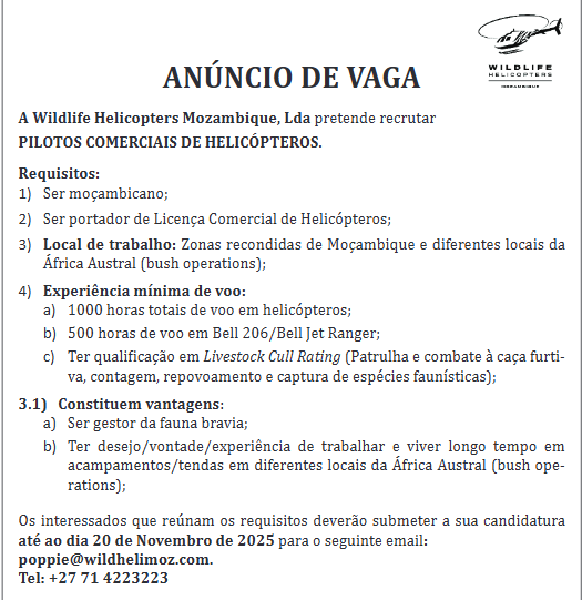 A Wildlife Helicopters Mozambique, Lda pretende recrutar