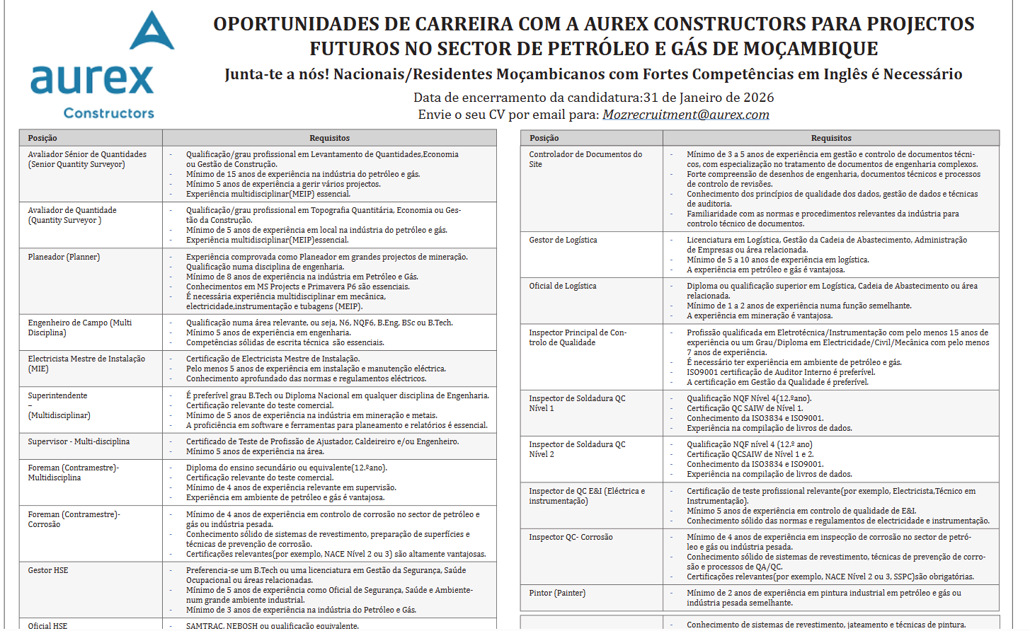 OPORTUNIDADES DE CARREIRA COM A AUREX CONSTRUCTORS PARA PROJECTOS FUTUROS NO SECTOR DE PETRÓLEO E GÁS DE MOÇAMBIQUE