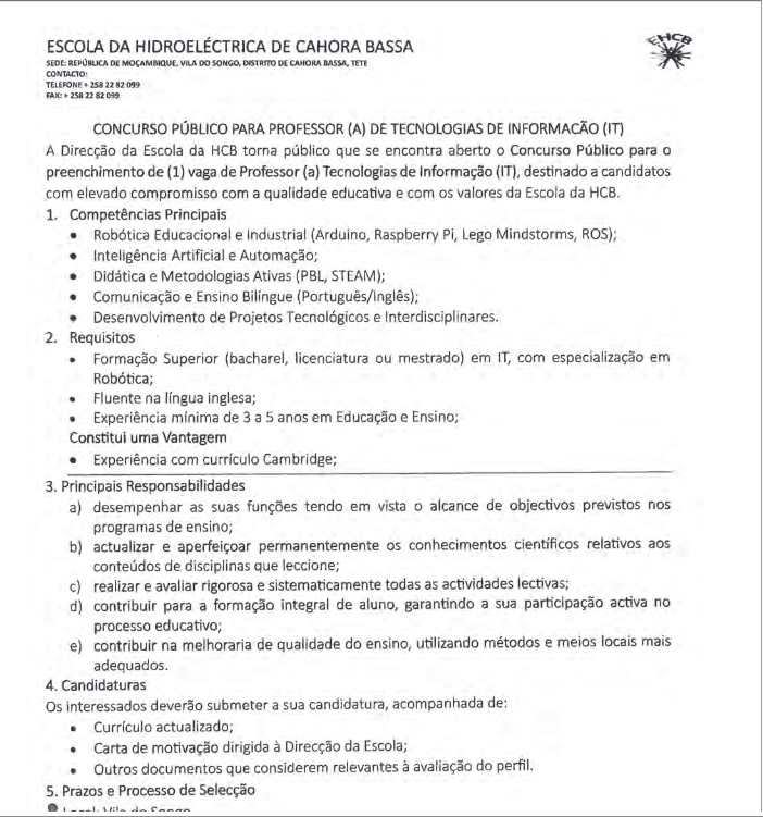 A Direcção da Escola da HCB torna público que se encontra aberto o Concurso Público para o preenchimento de (1) vaga de Professor (a) Tecnologias de Informação (IT), destinado a candidatos com elevado compromisso com a qualidade educativa e com os valores da Escola da HCB.
