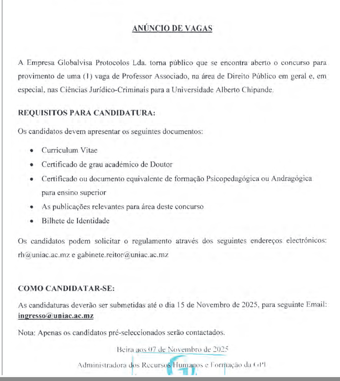 A Empresa Globalvisa Protocolos Lda. torna público que se encontra aberto o concurso para provimento de uma (1) vaga de Professor Associado, na área de Direito Público em geral e, em especial, nas Ciências Jurídico-Criminais para a Universidade Alberto Chipande