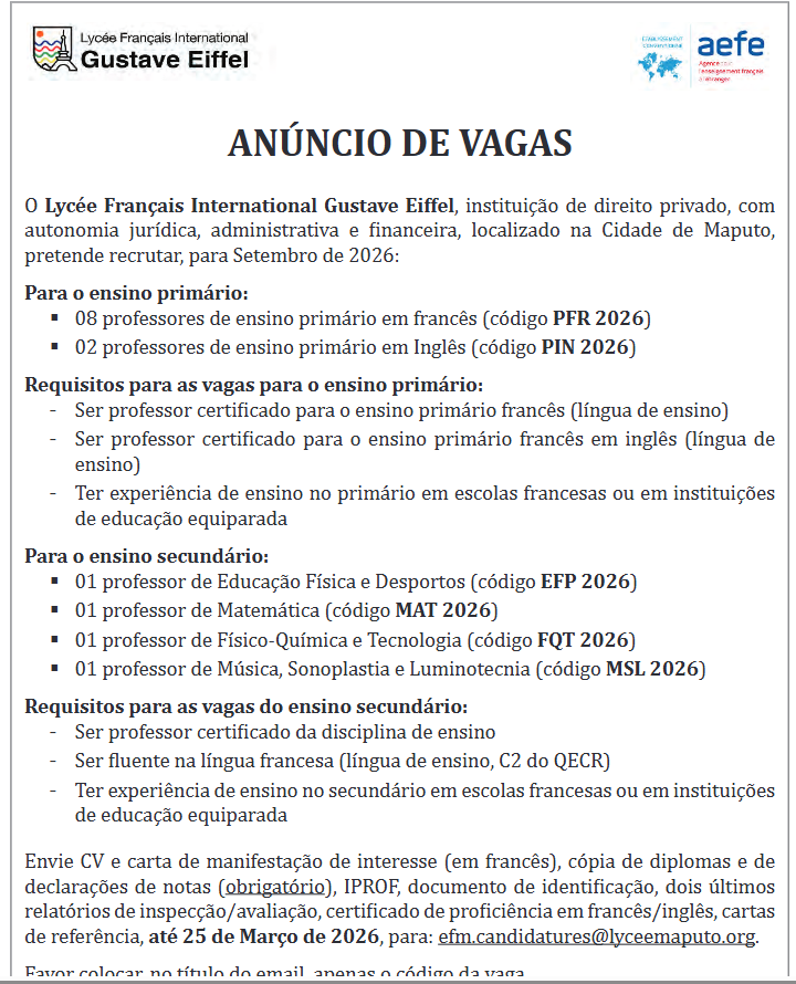 O Lycée Français International Gustave Eiffel, instituição de direito privado, com autonomia jurídica, administrativa e financeira, localizado na Cidade de Maputo, pretende recrutar, para Setembro de 2026: