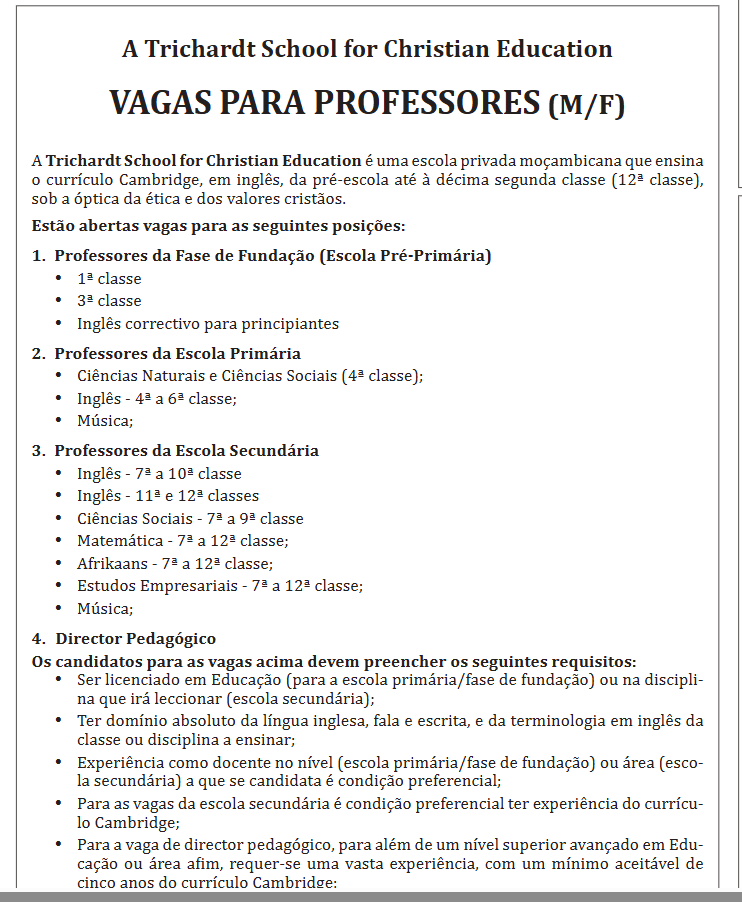 - Para a vaga de director pedagógico, para além de um nível superior avançado em Educação ou área afim, requer-se uma vasta experiência, com um mínimo aceitável de cinco anos do currículo Cambridge: