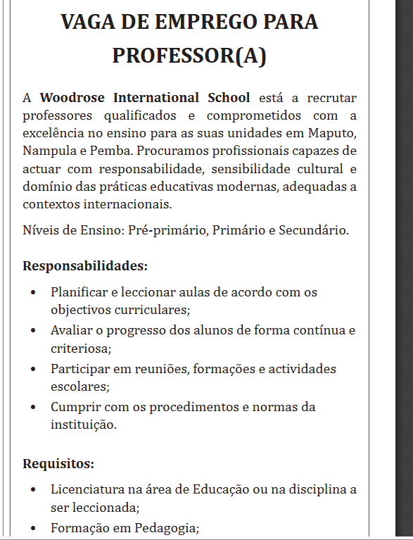 A Woodrose International School esta a recrutar professores qualificados e comprometidos com a excelência no ensino para as suas unidades em Maputo, Nampula e Pemba. Procuramos profissionais capazes de actuar com responsabilidade, sensibilidade cultural e domínio das práticas educativas modernas, adequadas a contextos internacionais.