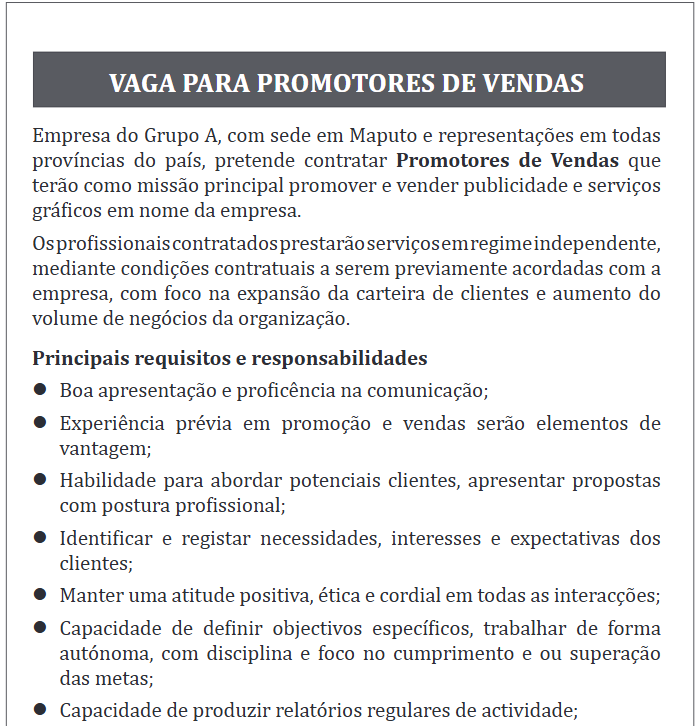 Empresa do Grupo A, com sede em Maputo e representações em todas províncias do país, pretende contratar Promotores de Vendas que terão como missão principal promover e vender publicidade e serviços gráficos em nome da empresa.