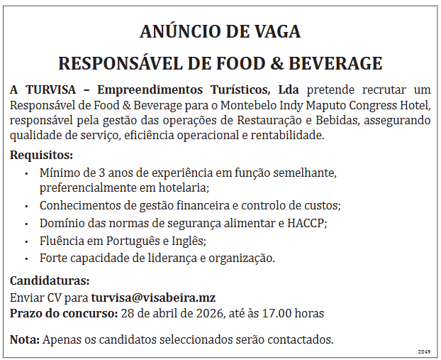 Responsável de Food & Beverage para o Montebelo Indy Maputo Congress Hotel, responsável pela gestão das operações de Restauração e Bebidas, assegurando qualidade de serviço, eficiência operacional e rentabilidade.