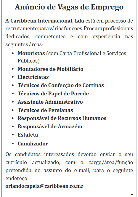A Caribbean Internacional, Lda esta em processo de recrutamento para várias funções. Procura profissionais dedicados, competentes e com experiência nas seguintes áreas: