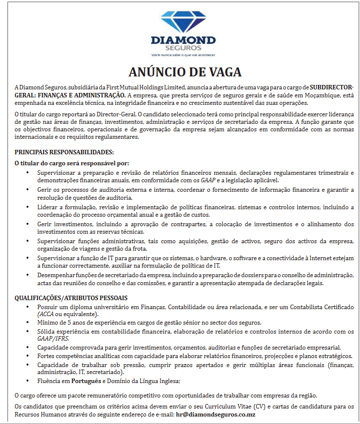 A Diamond Seguros, subsidiaria da First Mutual Holdings Limited, anuncia a abertura de uma vaga para o cargo de SUBDIRECTOR-GERAL: FINANÇAS E ADMINISTRAÇÃO. A empresa, que presta serviços de seguros gerais e de saúde em Moçambique, está empenhada na excelência técnica, na integridade financeira e no crescimento sustentável das suas operações.
