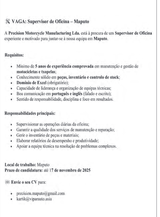 A Precision Motorcycle Manufacturing Lda. esta à procura de um Supervisor de Oficina experiente e motivado para juntar-se à nossa equipa em Maputo.