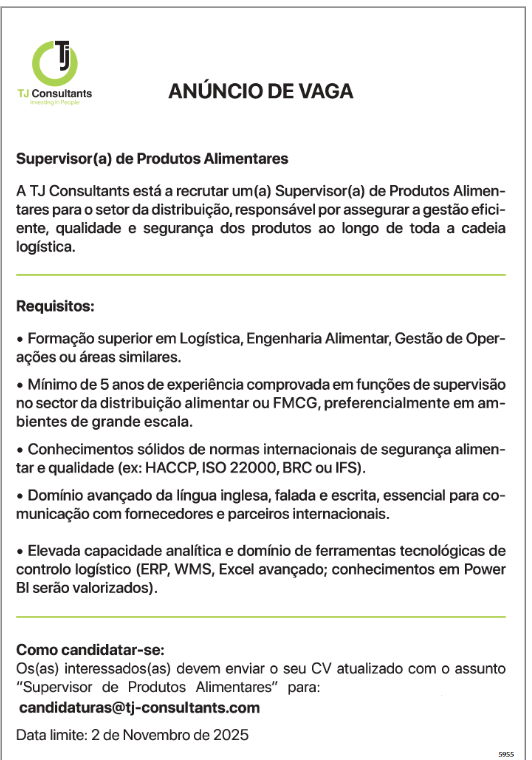 A TJ Consultants está a recrutar um(a) Supervisor(a) de Produtos Alimentares para o setor da distribuição, responsável por assegurar a gestão eficiente, qualidade e segurança dos produtos ao longo de toda a cadeia logística.