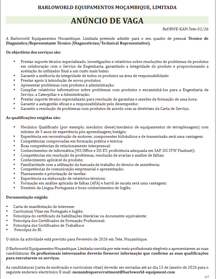 As candidaturas (carta de motivação e curriculum vitae) deverão ser enviada até ao dia 15 de Janeiro de 2026 para o seguinte endereço eletrónico E-mail: mozambiquerecruitment@barloworld-equipment.com