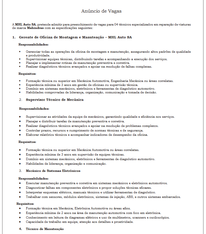 A MHL Auto SA, pretende admitir para preenchimento de vagas para 04 técnicos especializados em reparação de viaturas de marca Mahindras com as especificações seguintes: