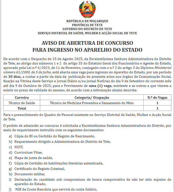 De acordo com o Despacho de 25 de Agosto 2025, da Excelentíssima Senhora Administradora do Distrito de Tete, ao abrigo dos números 1 e 2 do artigo 35 do Estatuto Geral dos Funcionários e Agente do Estado, aprovado pela Lei n.º 4/2023, de 11 de Fevereiro, conjugado com o n.º 2 do artigo 3 do Diploma Ministerial número 61/2000, de 5 de Julho, esta aberta uma vaga para ingresso no Aparelho do Estado, por um período de 30 dias, a contar a partir da data da publicação do presente aviso nos órgãos de Comunicação Social, fixação na Vitrina deste Serviço e Jornal Diário e/ou jornal Notícias do dia 9 de Setembro do corrente mês até dia 9 de Outubro de 2025, para o Provimento de uma (1) vaga, existente e as outras a que vierem a existir no prazo de validade do mesmo, de acordo com a informação abaixo descrita: Carreira de: Técnico de Medicina Preventiva e Saneamento de Meio ( 1 vaga).