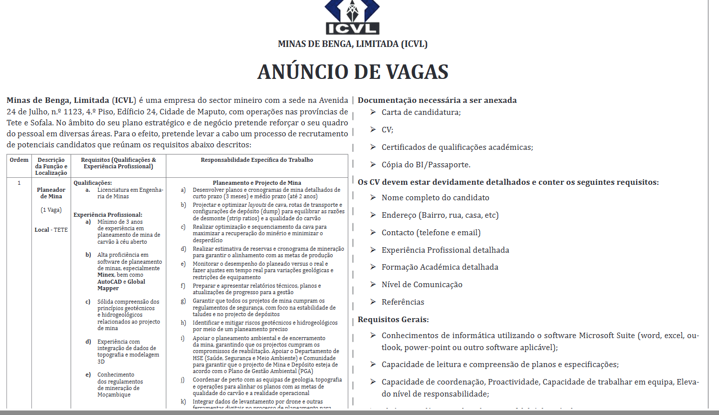 Minas de Benga, Limitada (ICVL) e uma empresa do sector mineiro com a sede na Avenida 24 de Julho, n.º 1123, 4.º Piso, Edíficio 24, Cidade de Maputo, com operações nas províncias de Tete e Sofala. No âmbito do seu plano estratégico e de negócio pretende reforçar o seu quadro do pessoal em diversas áreas. Para o efeito, pretende levar a cabo um processo de recrutamento de potenciais candidatos que reúnam os requisitos abaixo descritos: