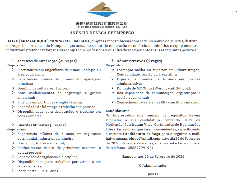 HAIYU (MOZAMBIQUE) MINING CO, LIMITADA, empresa moçambicana com sede no bairro de Murrua, distrito de Angoche, província de Nampula, que actua no sector de mineração e comércio de minérios e equipamentos industriais, pretende reforçar a sua equipa com profissionais qualificados e experientes para as seguintes posições:
