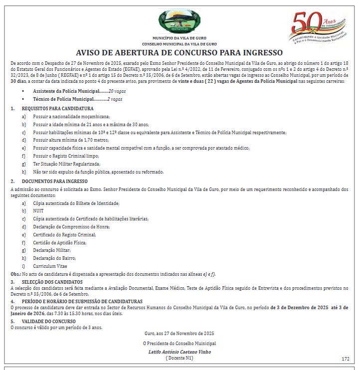 De acordo com o Despacho de 27 de Novembro de 2025, exarado pelo Exmo Senhor Presidente do Conselho Municipal da Vila de Guro, ao abrigo do numero 1 do artigo 18 do Estatuto Geral dos Funcionários e Agentes do Estado (EGFAE), aprovado pela Lei n.ª 4/2022, de 11 de Fevereiro, conjugado com os nes 1 e 2 do artigo 4 do Decreto n.º 32/2023, de 8 de Junho ( REGFAE) e ne 1 do artigo 15 do Decreto n.º 35/2006, de 6 de Setembro, estao abertas vagas de ingresso ao Conselho Municipal, por um periodo de 30 dias, a contar da data indicada no ponto 4 do presente aviso, para provimento de vinte e duas (22 ) vagas de Agentes da Policia Municipal nas seguintes carreiras: