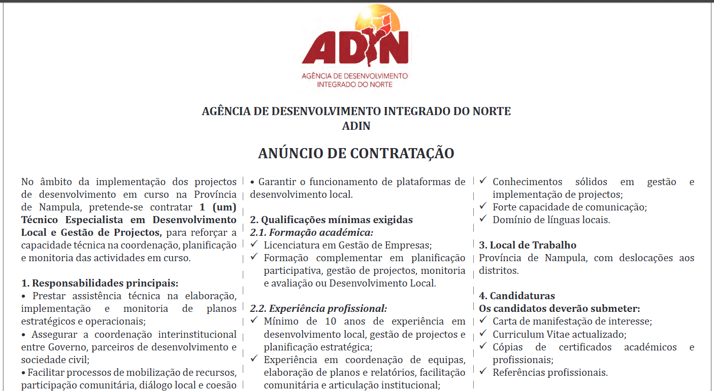 As candidaturas devem ser enviadas para o email abaixo, num prazo de 15 dias após a primeira publicação do presente anúncio: recursoshumanos@adin.gov.mz
