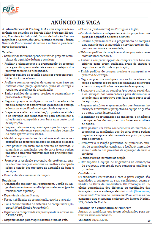 Os candidatos interessados e com o perfil exigido são convidados a submeter as suas candidaturas acompanhadas de Carta de Candidatura, CV, Fotocopia do BI, copias autenticadas dos diplomas ou certificados das formações para o endereço eletrónico info@fuse.co.mz, com assunto “Técnico de Procurement”, ou enviar os documentos para o seguinte endereço: Av. Samora Machel, 172, Cidade Da Matola. Encoraja-se a candidatura de Mulheres