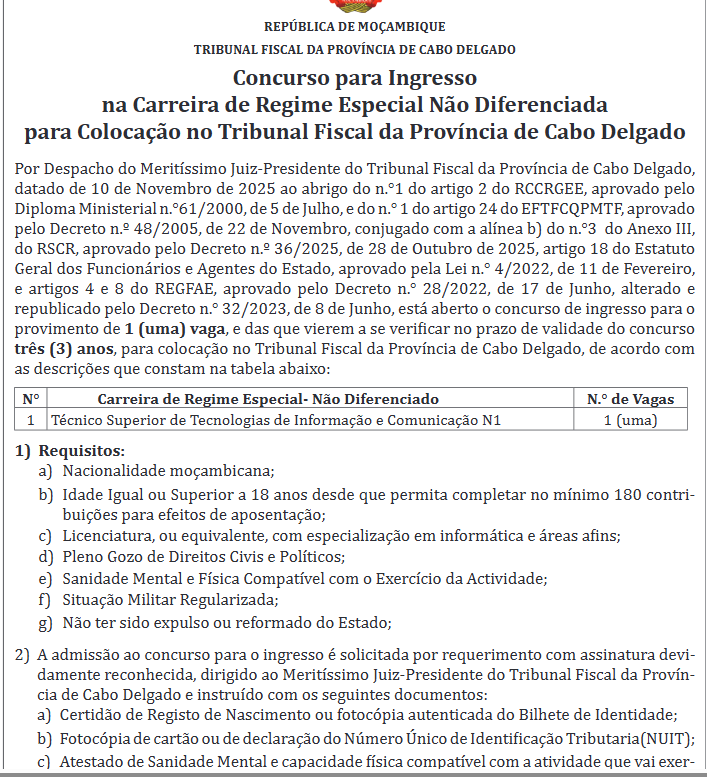 Por Despacho do Meritíssimo Juiz-Presidente do Tribunal Fiscal da Província de Cabo Delgado,datado de 10 de Novembro de 2025 ao abrigo do n.°1 do artigo 2 do RCCRGEE, aprovado pelo Diploma Ministerial n.°61/2000, de 5 de Julho, e do n.° 1 do artigo 24 do EFTFCQPMTF, aprovado pelo Decreto n.º 48/2005, de 22 de Novembro, conjugado com a alínea b) do n.°3 do Anexo III, do RSCR, aprovado pelo Decreto n.º 36/2025, de 28 de Outubro de 2025, artigo 18 do Estatuto Geral dos Funcionários e Agentes do Estado, aprovado pela Lei n.° 4/2022, de 11 de Fevereiro, e artigos 4 e 8 do REGFAE, aprovado pelo Decreto n.° 28/2022, de 17 de Junho, alterado e republicado pelo Decreto n.° 32/2023, de 8 de Junho, está aberto o concurso de ingresso para o provimento de 1 (uma) vaga, e das que vierem a se verificar no prazo de validade do concurso três (3) anos, para colocação no Tribunal Fiscal da Província de Cabo Delgado, de acordo com as descrições que constam na tabela abaixo: