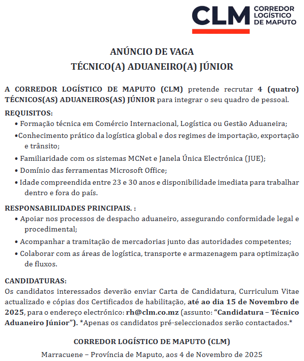 Os candidatos interessados deverão enviar Carta de Candidatura, Curriculum Vitae actualizado e cópias dos Certificados de habilitação, até ao dia 15 de Novembro de 2025, para o endereço electrónico: rh@clm.co.mz (assunto: “Candidatura – Técnico Aduaneiro Júnior”). *Apenas os candidatos pré-seleccionados serão contactados.*