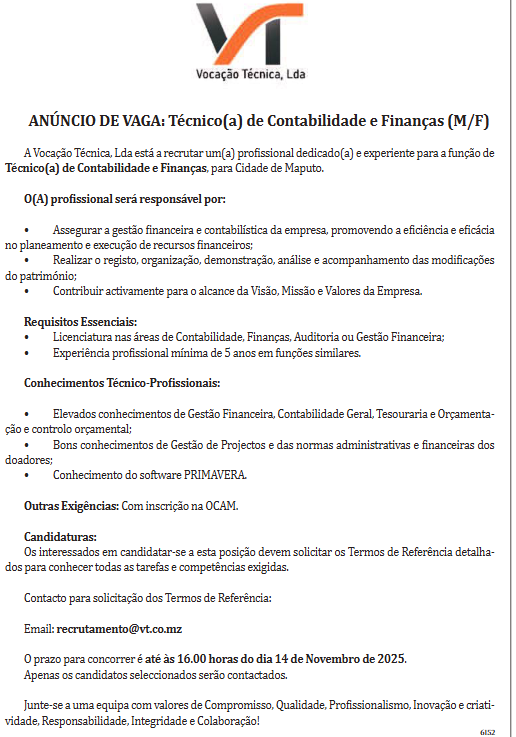 A Vocação Técnica, Lda esta a recrutar um(a) profissional dedicado(a) e experiente para a função de Técnico(a) de Contabilidade e Finanças, para Cidade de Maputo.